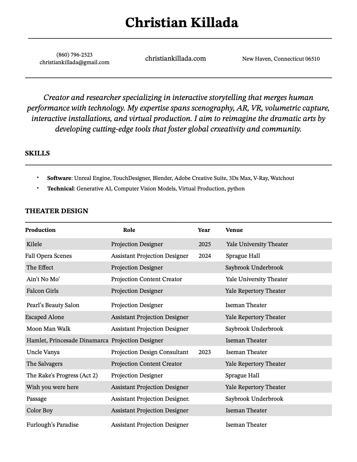 Creator and researcher with specic interest in interactive storytelling that merges human performance with technology, my expertise spans scenography, AR, VR volumetric capture and interactive installation with the goal of reimagining dramatic arts to foster global creativity and community through cutting edge tools.